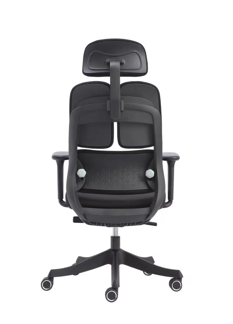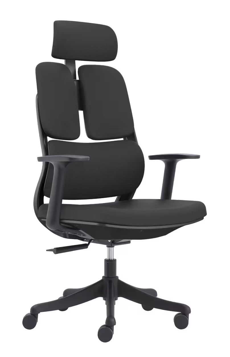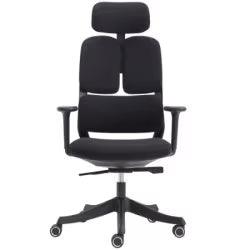 Ergonomska stolica u crnoj boji sa tapaciranim sedištem i naslonom, sedište sastavljeno od špera, sunđera debljine 8cm, tapacirano uzglavlje podesivo po visini i nagibu, elegantna PVC crna baza sa gumiranim točkićima, podešavanje visine gasnim amortizerom u crnoj boji, Slide sedišta (podsivo po dubini), sinhro mehanizam sa mogućnošću podešavanja nagiba stolice u tri položaja, rukohvati sa gumiranom oblogom podesivi po visini i dubini, opterećenje do 120kg. Ukupna visina sa uzglavljem : min: 118 cm - max:125 cm